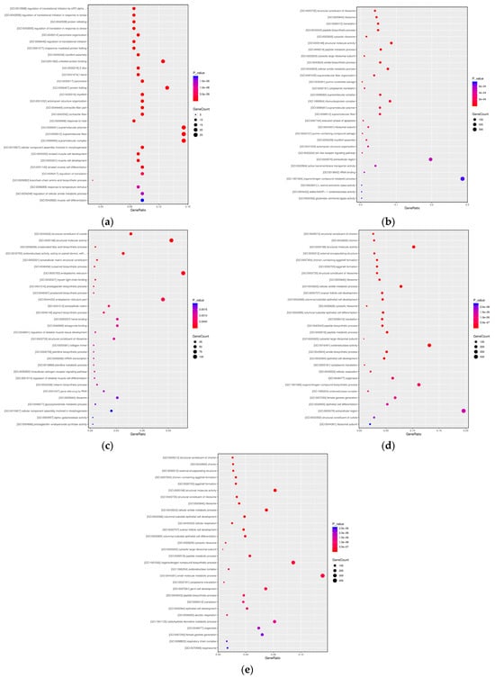 Transcriptome GO analysis of A. pernyi pupae at different developmental stages ((a): T1 vs. CK; (b): T2 vs. CK; (c): T3 vs. CK; (d): T4 vs. CK; (e): T5 vs. CK).