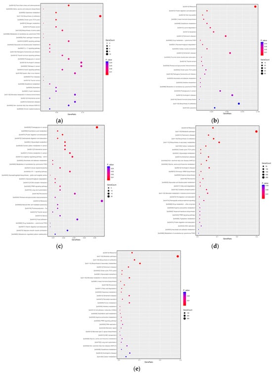 Transcriptome KEGG analysis of A. pernyi pupae at different developmental stages ((a): T1 vs. CK; (b): T2 vs. CK; (c): T3 vs. CK; (d): T4 vs. CK; (e): T5 vs. CK).