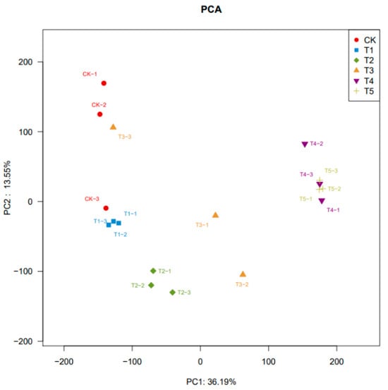 Principal component analysis (PCA) is an unsupervised data analysis method that recombines all identified metabolites into a set of new composite variables. It selects a few composite variables from the analysis to reflect as much information as possible from the original variables, thereby achieving dimensionality reduction. Additionally, PCA of metabolites can reflect the overall variability between and within sample groups. Analysis of the PCA score plots of A. pernyi pupae at different developmental stages revealed that the points within each group were clustered closely, indicating a reliable model. The PCA points for the CK and T1 groups were distributed in the second quadrant, while the T2 and T3 groups were in the third quadrant, the T4 group in the fourth quadrant, and the T5 group in the first quadrant. This distribution indicates significant differences in metabolites among A. pernyi pupae at different developmental stages (Figure 1).