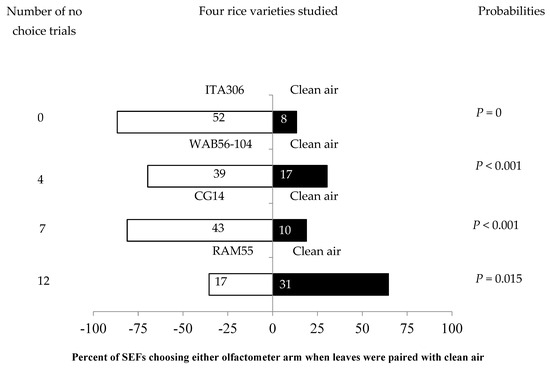 The four rice varieties showed different levels of attractiveness to the SEFs when paired with clean air. Figure 1 shows the number of attracted females. SEFs were significantly attracted to the leaf odor cues of each of three rice varieties (ITA306, WAB56-104, and CG14) when they were paired with clean air. Therefore, rice accession RAM 55 repelled SEF massively during the test. Also, the number of “no choice” records varied according to the variety tested (Figure 1).
