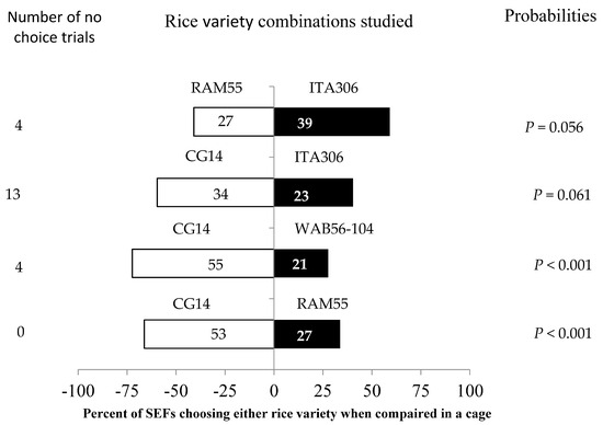 Response of SEFs when offered the choice between potted plants from two rice varieties in a screened cage. The numbers in the bars represent the total number of females that chose either rice variety. The probabilities given to the right of the bars are for the binomial test.