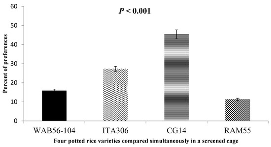 When given a choice inside the screened cage, Figure 4 illustrates the attraction of SEF females to the four rice varieties tested. The results demonstrated a clear difference in insect preference for some genotypes compared to others, as follows: RAM 55 < WAB56-104 < ITA306 < CG14.
