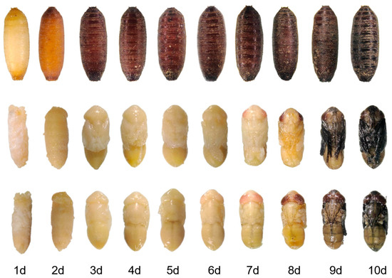 Based on well-documented morphological and molecular benchmarks in necrophagous fly development [16,17,18], we selected day 1, day 5, and day 9 to represent the early, middle, and late pupal stages, respectively. Day 1 corresponds to the onset of puparium formation and early organ primordia appearance; day 5 marks the phase of active tissue reorganization and differentiation; and day 9 coincides with late-stage pigmentation and near-complete adult morphogenesis.