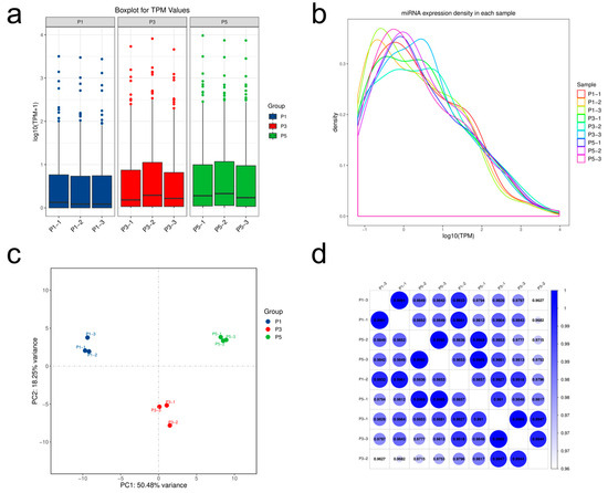 Comprehensive analysis of miRNA expression dynamics during pupal development in Sarcophaga peregrina. (a) Boxplot of log10(TPM + 1) shows increasing miRNA expression from P1 to P5, with individual dots representing sample-level expression values. (b) Density plots indicate a shift toward higher expression levels in P3 and P5. (c) PCA reveals clear stage-specific clustering, with PC1 explaining 50.48% of variance. (d) Pearson correlation heatmap shows high within-group similarity and intergroup divergence, with circle size and color intensity indicating the strength of correlation between samples.