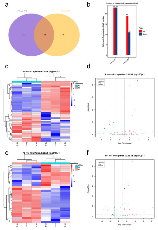 To capture dynamic shifts in miRNA expression during pupal development, differential expression analysis was performed for two pairwise comparisons: P3 vs. P1 and P5 vs. P3. miRNAs were considered significantly differentially expressed if q-value < 0.05 and |log2FC| > 1. A total of 46 miRNAs were identified in the P3 vs. P1 comparison (23 upregulated, 23 downregulated), and 30 miRNAs were detected in the P5 vs. P3 group (19 upregulated, 11 downregulated), with 15 miRNAs overlapping between comparisons (Figure 3a,b), indicating sustained expression regulation across stages. Hierarchical clustering revealed more pronounced divergence between P3 and P1, with P3 samples showing consistently elevated levels for multiple miRNAs (Figure 3c). The corresponding volcano plot demonstrated a balanced distribution of significantly altered miRNAs, with some upregulated miRNAs exhibiting log2FC values > 6 (Figure 3d). Although differences between P5 and P3 were more moderate overall, several miRNAs still showed persistent upregulation or downregulation at the late stage, including cases where log2FC exceeded 8 (Figure 3e,f), suggesting continued transcriptional regulation in late pupation.