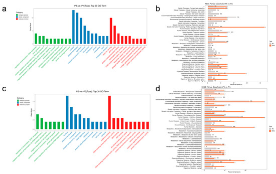 Functional enrichment of predicted target genes of differentially expressed miRNAs in Sarcophaga peregrina pupae. (a) Gene Ontology (GO) enrichment of P3 vs. P1 target genes, showing the top 30 significant terms across biological processes (BP), molecular functions (MF), and cellular components (CC). (b) KEGG pathway enrichment for P3 vs. P1 targets, highlighting involvement in MAPK, Wnt, Hippo, and ecdysone signaling pathways, as well as glycolysis/gluconeogenesis. (c) GO enrichment of P5 vs. P3 target genes, emphasizing roles in redox balance, hypoxia response, and autophagy. (d) KEGG pathway enrichment for P5 vs. P3 targets, with strong enrichment in HIF-1, FoxO, autophagy, and oxidative phosphorylation pathways.