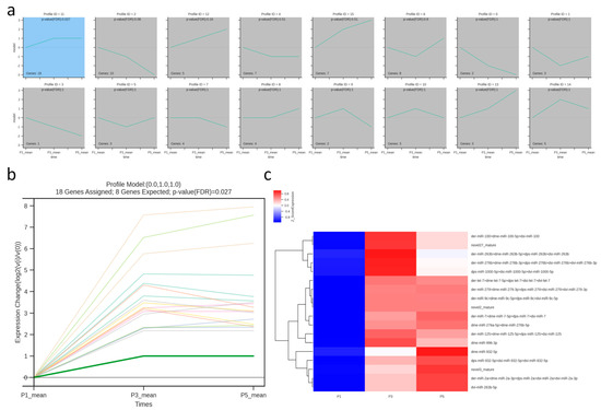 Time-series clustering of differentially expressed miRNAs in Sarcophaga peregrina pupae using STEM. (a) STEM clustering identified 16 temporal profiles; only Profile 11 showed significant enrichment (FDR = 0.027). (b) Line plot of Profile 11 showing a consistent upregulation trend from P1 to P5. (c) Heatmap of the 18 miRNAs assigned to Profile 11, most of which exhibit increasing abundance over time. Different colored lines represent individual miRNAs within Profile 11 and are used solely for visual distinction.