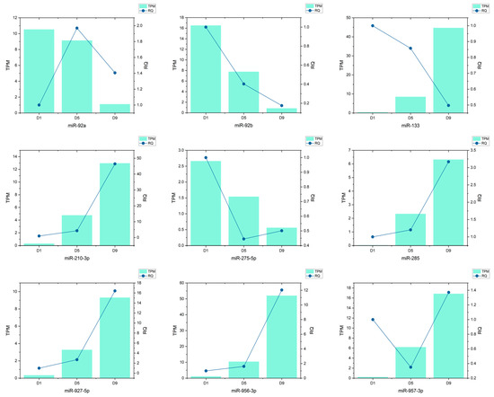 To validate the expression trends of differentially expressed miRNAs identified via high-throughput sequencing, we performed qRT-PCR analysis on nine representative candidates with distinct temporal patterns. Validation was conducted at three key time points—day 1 (D1), day 5 (D5), and day 9 (D9)—and compared against transcriptomic TPM values. Most miRNAs showed expression trends consistent with the sequencing data, with a strong correlation observed between RQ (relative quantification) and TPM levels.