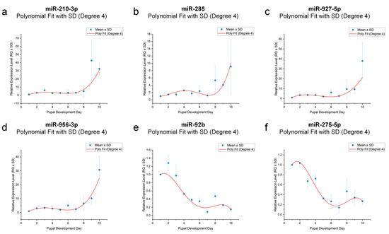 Polynomial regression modeling of miRNA expression across pupal development. (a) miR-210-3p expression trend fitted with a 4th-degree polynomial curve. (b) miR-285 expression trend fitted with a 4th-degree polynomial curve. (c) miR-927-5p expression trend fitted with a 4th-degree polynomial curve. (d) miR-956-3p expression trend fitted with a 4th-degree polynomial curve. (e) miR-92b expression trend fitted with a 4th-degree polynomial curve. (f) miR-275-5p expression trend fitted with a 4th-degree polynomial curve. Each panel displays mean ± SD and the fitted curve (red) over the 10-day pupal stage.