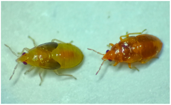 So far, no mutations have ever been reported for this insect species, except for the ambar mutation in 2022 [8]. This mutation, autosomic and recessive, confers an orange color to the nymphs, clearly distinguishable from the wild-type color which is yellow (Figure 1). Mutations affecting external body coloration may become very useful markers in studies of dispersion, adaptation, and population genetics, and can also serve as indicators for studies on mating and sexual competition.
