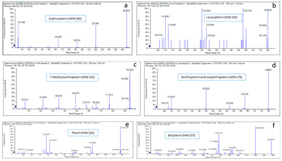 According to the fluorescence color and Rf values (corresponding to the relative migration) from the literature and standards, spot O was tentatively identified as erythropterin, spot P as leucopterin, spot Y1 as xanthopterin, spot Y2 as 7-methylxanthopterin, spot V as isoxanthopterin, spot B1 as pterin, and spot B2 as biopterin [11,13]. Tandem mass spectrometry after separation by liquid chromatography (LC/MS/MS) of the extracted compounds from the cellulose plate confirmed their identity. The molecular mass and the fragmentation of the cellulose-extracted compounds perfectly matched those predicted by their molecular formula (Figure 3).