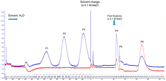 Separation of O. laevigatus fluorescent compounds by SEC. Red line: Absorbance at 455 nm. Blue line: Absorbance at 360 nm.
