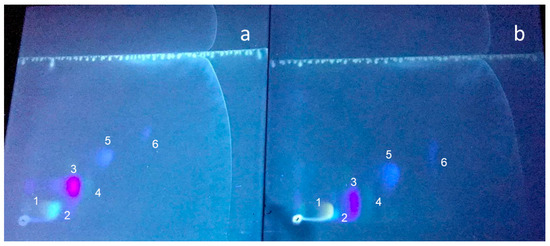 Fractions collected from each peak were concentrated by lyophilization with further solubilization in MAW. To further purify the components of each fraction, aliquots were subjected to TLC in the two solvents (Figure A1). The main fluorescent components revealed under UV light were scraped from the cellulose plate, dissolved in MAW, and analyzed by LC/MS/MS. From the fluorescence color and the LC/MS/MS identification, it was concluded that peak 1 was a mixture of biopterin, pterin, and 7-methylxanthopterin; peak 2 contained a mixture of isoxanthopterin (the main component) and xanthopterin; peak 3 only contained leucopterin; and peak 6 contained erythropterin as the main component. Peaks 4 and 5 did not show any fluorescent compound that could be visualized.