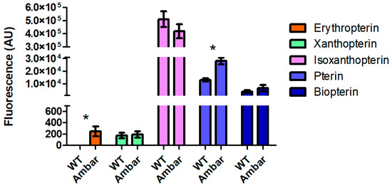 Qualitative comparison of the TLC chromatograms of the wild type and the ambar mutant revealed three clear differences: erythropterin was in trace amounts in the wild type whereas leucopterin was increased, and the spot corresponding to pterin was much fainter than in the chromatogram of the ambar mutant. These differences were further confirmed (except for leucopterin) by quantitative analysis of the fluorescence intensity, as shown in Figure 6. Erythropterin, in addition to its fluorescence under UV light, absorbs light in the visible spectrum, being an orange-red pigment. Therefore, its accumulation in the ambar mutant seems to be the reason for the orange color of nymphs. Indeed, the correlation of erythropterin content and insect body pigmentation has been described in other Hemiptera such as Dysdercus spp. [13] or in Pyrrhocoris apterus after the analyses of erythropterin in several body color mutants [15].