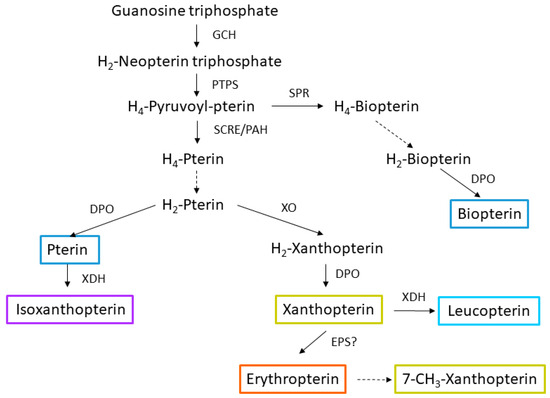 - Ferré, J. Biosynthesis of pteridines in insects: A review. Insects 2024, 15, 370. [Google Scholar] [CrossRef] [PubMed]