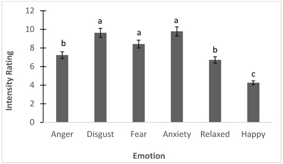 Emotion responses to bed bugs (mean ± SE) based on the Discrete Emotions Questionnaire. Different letters indicate significantly different means.