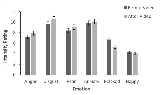 Participants rated their anger, on average, near “somewhat” (before = 7.21; after = 7.95), their disgust near “somewhat” (before = 9.50; after = 10.47), their fear as a bit above “somewhat” (before = 8.35; after = 9.01), and their relaxation from “slightly” to “not at all” (before = 6.76; after = 5.26). Anxiety and happiness had no statistically significant change before and after the video, but anxiety was a bit above “somewhat” (9.75) and happiness was almost “not at all” (4.27).