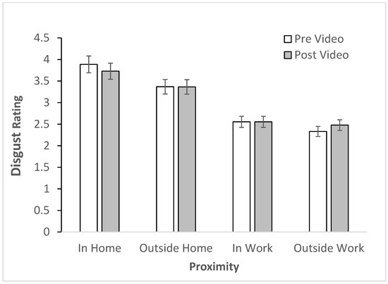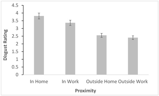 Prior to the video, participants rated their disgust and fear of seeing bed bugs at varying levels of proximity and personal space on a scale from not at all (1) to an extreme amount (5). Participants had the highest disgust rating (quite a bit) for inside the home (M = 3.81), then (“moderate”) inside their work (M = 3.37), then between “somewhat” and “moderate” for outside the home (M = 2.56), and finally the least (“somewhat”) for outside of work (M = 2.41). A three-way mixed ANOVA was conducted to examine the effects of time (before or after video); proximity (inside/outside/home/work), and sex (male or female) on disgust ratings. There was a statistically significant main effect of proximity using the Greenhouse-Geisser correction F(2.15, 307.70) = 239.40, p < 0.001. LSD post hoc tests revealed that each of these levels was statistically significantly different from each other.