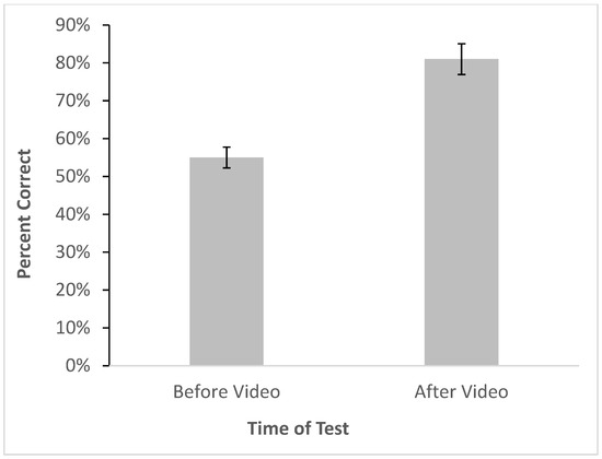 Participants’ knowledge about bed bugs was tested prior to exposure to a short (~10 min), self-administered video recorded by the researchers. Results from the pretest showed that before the study, participants were able to score an average of 9.37 (55%) on the knowledge test, demonstrating, with a failing grade, a deficit in their knowledge about bed bugs. After the study, participants were given the same knowledge test and scored 13.63 (81%) on average, a passing grade. A paired-samples t test revealed the knowledge difference was statistically significant, t(156) = −27.31, p < 0.001 showing the incredible effectiveness of even this short knowledge intervention (Figure 7).