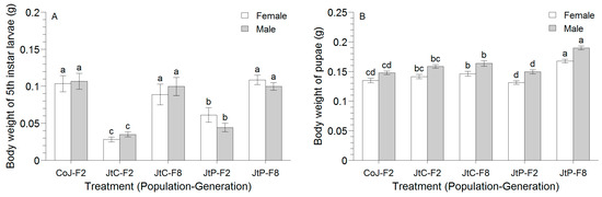 | Pupae | 59 | 8.6 ± 0.1 b | 68 | 9.1 ± 0.1 a | 36 | 8.6 ± 0.2 b | 45 | 8.4 ± 0.1 b |