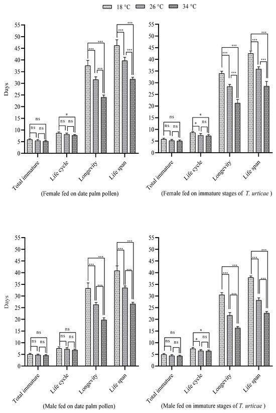 Using repeated-measures ANOVA analysis between groups showed significant differences at the various temperatures when fed on date palm pollen and immature stages of T. urticae for female developmental stages, reproductive phases, and fecundity; the life cycle (F = 12.260; df = 2; p < 0.001) (F = 14.904; df = 2; p < 0.001); longevity (F = 224.117; df = 2; p < 0.001) (F = 327.088; df = 2; p < 0.001); life span (F = 222.786; df = 2; p < 0.001) (F = 262.969; df = 2; p < 0.001) (Figure 1); total eggs/female (F = 22.675; df = 2; p < 0.001) (F = 6.500; df = 2; p < 0.001), and daily rate/female (F = 223.347; df = 2; p < 0.001) (F = 73.513; df = 2; p < 0.001) for N. cucumeris fed on date palm pollen and immature stages of T. urticae, respectively. A similar analysis for males also revealed significant differences for life cycle (F = 3.537; df = 2; p < 0.05) (F = 12.131; df = 2; p < 0.001), longevity (F = 186.871; df = 2; p < 0.001) (F = 611.789; df = 2; p < 0.001), and life span (F = 264.355; df = 2; p < 0.001) (F = 1022.879; df = 2; p < 0.001) (Figure 1).
