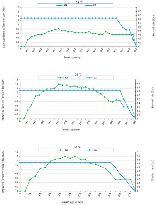 The age-specific fecundity (Mx), rate of survival (Lx) of N. cucumeris, and deposited eggs were affected by the temperature and food provided (Figure 3 and Figure 4). In addition, the life table parameters (R0, rm, λ, and T) were affected by the food type at the same temperature. The data showed that N. cucumeris, when fed on date palm pollen, exhibited prolonged net reproductive rates (R0) of 13.42, 22.52, and 16.16 offspring/individual as compared to those fed on immature stages of T. urticae of 8.46, 9.72, and 8.99 offspring/individual at 18, 26, and 34 °C, respectively. The predicted number of new females who would contribute to the population daily, as indicated by the finite rate of rise (λ), had comparable outcomes. The finite rate of increase was influenced by the type of food used. The values of (λ) were the highest when the predator consumed date palm pollen at rates of 1.12, 1.17, and 1.18 day−1. Conversely, the rates of (λ) decreased when the predator fed on immature T. urticae, reaching the lowest rates of 1.11, 1.13, and 1.14 day−1 at temperatures of 18, 26, and 34 °C, respectively. The present data showed that the intrinsic rate of increase (rm) was 0.12, 0.16, and 0.17 day−1 when fed on date palm pollen, and the correspondent values were 0.10, 0.12, and 0.13 day−1 when fed on immature stages of T. urticae at 18, 26, and 34 °C, respectively. The mean generation time (T) was 22.48, 19.59, and 16.48 days when fed on date palm pollen, while that of the immature stages of T. urticae were the shortest at 20.88, 18.44, and 16.76 days at 18, 26, and 34 °C, respectively (Figure 5).