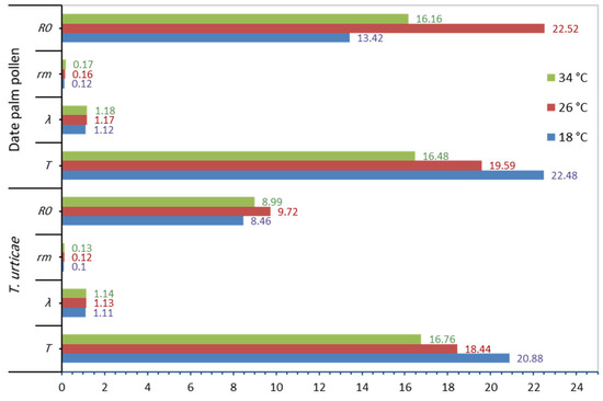 Our results revealed that the highest net reproductive rate (R0) was 22.52 offspring/individual when they were fed date palm pollen and 9.72 offspring/individual when they were fed T. urticae at 26 °C. Yazdanpanah et al. [24] reported that (R0) of N. cucumeris fed on T. urticae at 25 ± 1 °C was 18.39, 6.15, 12.34, 8.71 for generation one (G1), (G10), (G20), and (G30), respectively. Moradi et al. [67] reported that the highest (R0) of N. neoagrestis fed on Tyrophagus putrescentiae was determined at 25 °C compared to 20 °C and 30 °C.