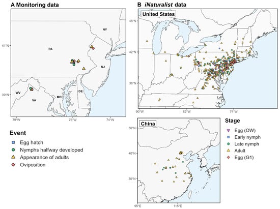 Geographic origins of observations of the spotted lanternfly (SLF) used to validate the phenology model. (A) Observations from monitoring studies represent the first dates of phenological events at locations in the eastern United States. (B) Observations in iNaturalist represent single encounters with the SLF at a specific time and location in the United States and China (top and bottom maps, respectively). A single location per county (United States) is shown to reduce clutter.