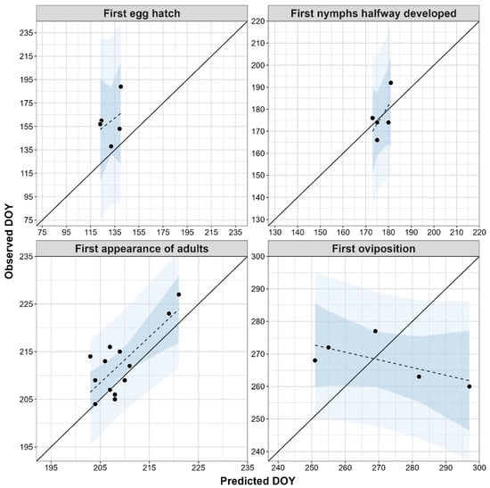 Scatterplots of predicted vs. observed dates (the day of the year, DOY) for four phenological events of the spotted lanternfly, based on published monitoring data for the United States. Each plot depicts the line of best fit calculated with a linear regression (dashed line), a 1:1 relationship between field- and model-predicted DOYs (black line), a 95% confidence interval (darker-blue shading), and a 95% prediction interval (light-blue shading).