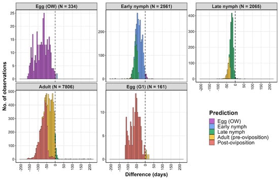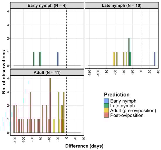 Histograms showing differences between predicted vs. observed dates (days) of life stages of the spotted lanternfly in China, based on the iNaturalist data. A value of 0 indicates no difference between dates (dashed line). Positive values may indicate model overprediction, wherein a life stage was observed before it was predicted to be present.