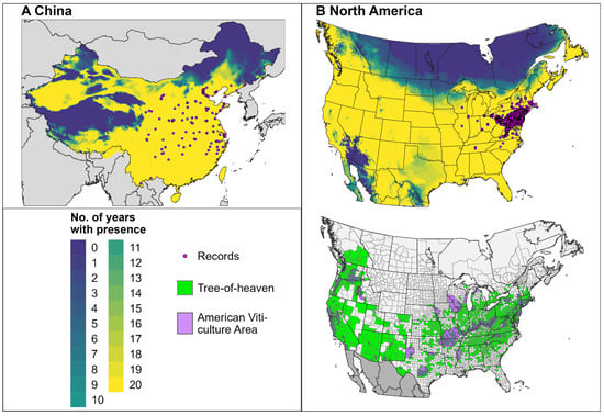 The modeled potential distributions for the spotted lanternfly in (A) China and (B) North America (top maps) according to DDRP runs for 20 recent years. Yellow areas were included in the potential distributions for all 20 years, whereas areas with cooler colors were excluded by climate stress for one or more years. Pink circles depict the approximate locations of the presence records used for model calibration and validation. The bottom map in (B) depicts county-level detections of the tree of heaven for Canada and the United States, as well as American Viticulture Areas.