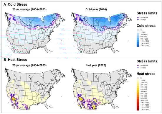 Maps of annual (A) cold stress and (B) heat stress accumulations for the spotted lanternfly in North America, produced by DDRP. Averages of stress accumulations over a 20-year period (2004–2023) (left panels) are compared to accumulations for an extreme year (right panels) in terms of the total area excluded by the cold or heat stress (2014 and 2023, respectively).