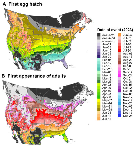 Maps of the predicted dates of (A) the first egg hatch and (B) the first appearance of adults for the spotted lanternfly for North America for 2023, produced by DDRP. The maps include estimates of climatic suitability, where long-term establishment is indicated by areas not under moderate (“excl.-moderate”, medium gray) or severe (“excl.-severe”, dark gray) climate stress exclusion. Areas with insufficient degree-day accumulation for an event to occur are indicated with light gray.