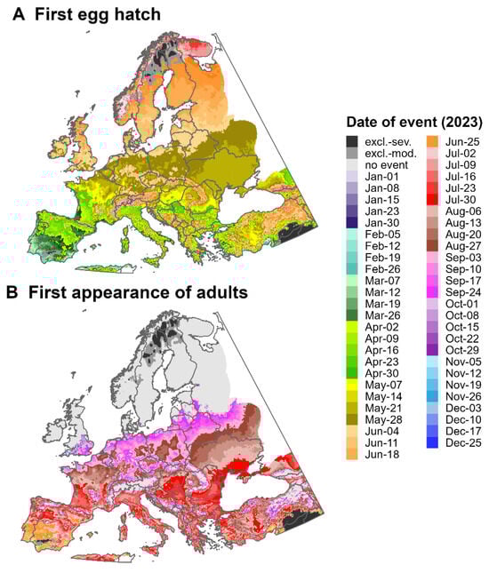 Maps of the predicted dates of (A) the first egg hatch and (B) the first appearance of adults for the spotted lanternfly for Europe for 2023, produced by DDRP. The maps include estimates of climatic suitability, where long-term establishment is indicated by areas not under moderate (“excl.-moderate”, medium gray) or severe (“excl.-severe”, dark gray) climate stress exclusion. Areas with insufficient degree-day accumulation for an event to occur and missing climate data are indicated with light gray and white, respectively.