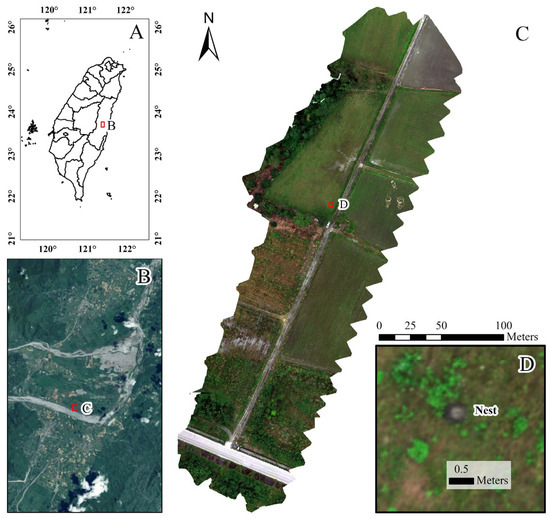 Study site location and UAV-derived orthomosaic imagery used for RIFA mound detection: (A) Red square on the map of Taiwan indicates the county of the study site; (B) red square on the Fenglin Township map indicates the location of the study site; (C) UAV-acquired orthomosaic image of the agricultural field, including surveyed area and landscape features; and (D) zoomed-in view highlighting a fire ant mound, with a spatial reference bar indicating the scale (0.5 m). All images were georeferenced through onboard GNSS and corrected with ground control points.