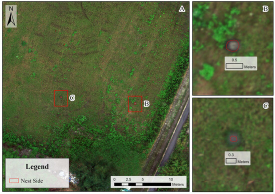 To balance image clarity with survey efficiency, the drone was operated at 40 m above ground level. At this flight height, a of approximately 2.6 cm per pixel was achieved, which is an adequate resolution for the identification of small features, such as RIFA mounds without excessive coverage loss per flight.