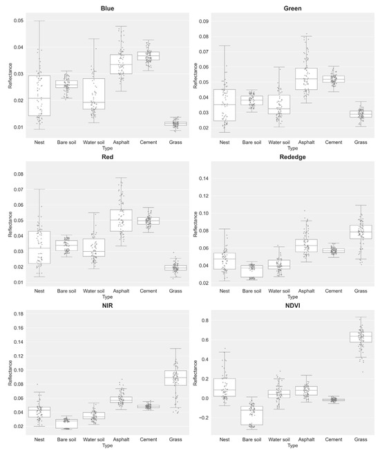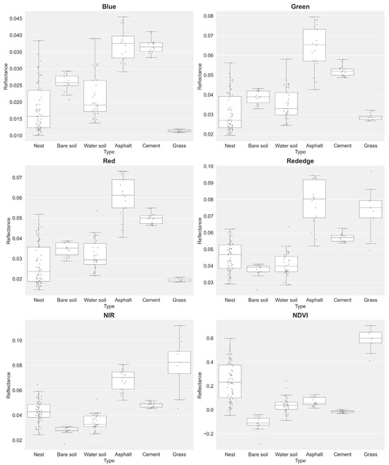 Box plots of pixel-level reflectance value distributions for different surface types across five spectral bands and the NDVI: Type 1: RIFA mounds, Type 2: bare soil, Type 3: water-containing soil, Type 4: asphalt, Type 5: cement, and Type 6: grass.