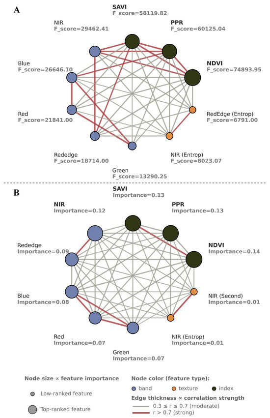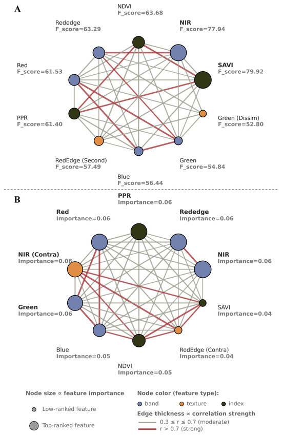 We performed feature extraction on the pixel-level data to examine the significance of spectral parameters at a finer spatial resolution. Linear analysis of ANOVA F-scores (Figure 6A) was conducted to determine the ability to discriminate between RIFA mounds and the surrounding environment for each feature. After removing highly collinear features (Pearson |r| > 0.7; e.g., PPR, SAVI, NIR, and Red), the NDVI, blue, and red-edge bands consistently exhibited the largest F-score across the dataset (Appendix A.1), implying that each of these bands had a strong linear relationship to the class goal. These bands could effectively separate pixels assigned to RIFA mounds from other pixels. Other features, such as the texture of NIR (entropy) and red-edge (entropy) bands, had moderate discriminative capacity, improving model performance. Highly intercorrelated features, especially those of correlation coefficient–based features, had lower F-scores and were therefore less informative.
