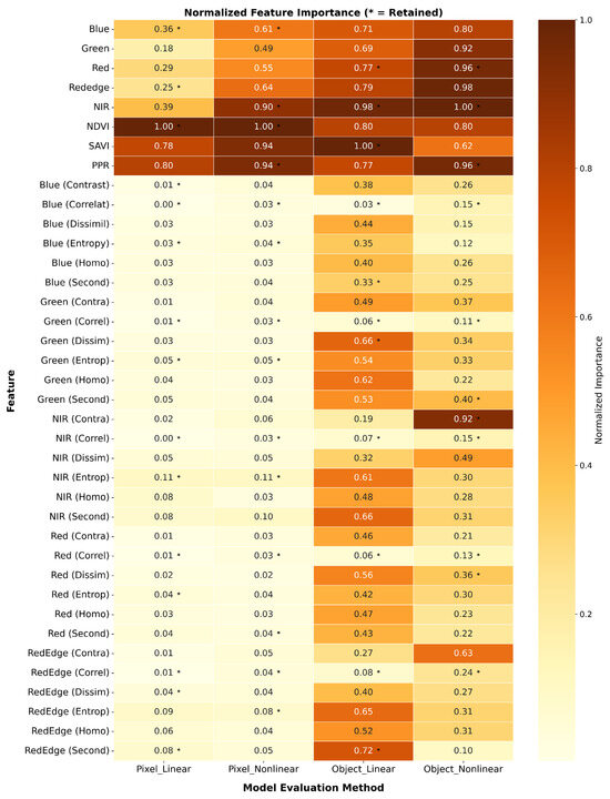 Normalized feature importance heatmap across four methodology configurations, with retained features marked. Spectral and index features exhibited consistently high importance. Asterisk (*) indicates whether a feature was retained under a given method.