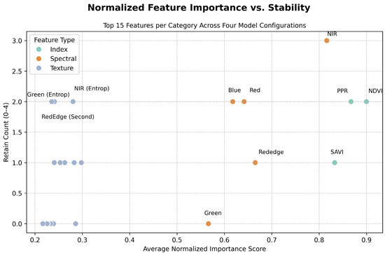 Figure 9 further illustrates the average importance of each feature alongside the frequency of its retention across the four methods. The NDVI and NIR features are positioned in the upper right quadrant, signifying their high importance and retention frequency. The PPR feature is also located in this quadrant and was retained under two of the methods. The majority of the texture features are positioned in the lower left quadrant of the figure, corresponding to low scores and retention frequencies. Among these features, only the NIR (entropy) and green (entropy) bands were retained under pixel-level methods.
