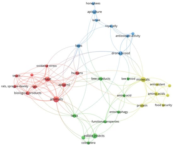 The analysis with the VOSviewer software produced a graph based on 180 keywords, of which 34 appeared at least twice. All of these were connected with other keywords, and therefore, they were included in the analysis. The representation is based on a cluster structure comprising four clusters (one of each colour—blue, red, green, yellow), with 128 links and a total link strength of 172. The keyword “animals” was highlighted as the most frequent keyword.