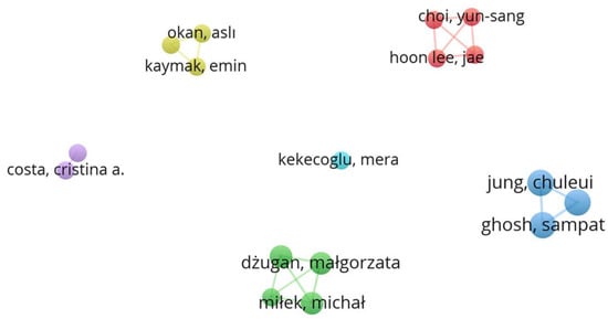 Figure 2 shows the schematic representation of the network between the authors of the works included in the review. Of the 196 authors, only 17 had a minimum of two publications. The graph in Figure 2 establishes six clusters, represented by different colours (yellow, red, lilac, cyan, blue, and green), with 19 links and a total link strength of 47, for the 17 items.