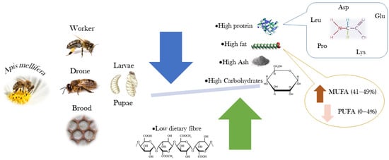 Honey bees (A. mellifera) have been nurtured by humans for millennia across the world. The life cycle of honey bees encompasses four principal stages, starting with the egg, then developing the larvae, progressing to the pupa and finally reaching the adult phase []. In these different stages, the physiology of the larvae changes, and so it happens with the chemical composition and elements of nutritional value, such as the protein and its amino acids, the fat and the corresponding fatty acids, minerals, or vitamins.