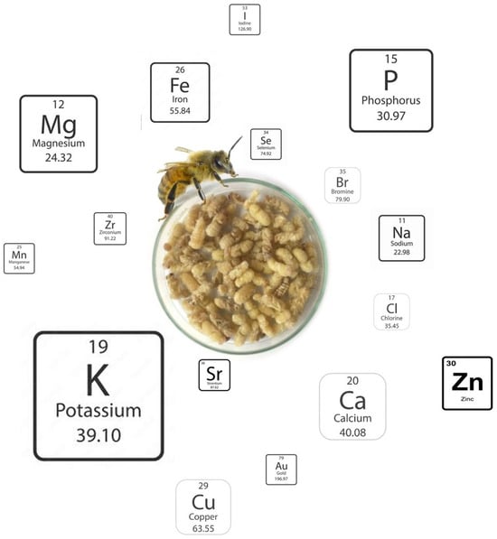 Fialho et al. [] evaluated the nutritional composition of larvae of mealworm (Tenebrio molitor) and crickets (Gryllus assimilis) and reported that the most abundant macro minerals were potassium and phosphorus, just like in the case of bee brood. Also, they reported that mealworms and crickets were low in sodium, calcium, and magnesium and contained some trace minerals like iron, manganese, zinc, and copper []. Oliveira et al. [] analysed the mineral content in two edible insects (Tenebrio molitor and Gryllus assimilis) and reported the presence of magnesium, phosphorus, and potassium in higher contents, but also copper, calcium, iron, zinc, manganese, and sodium. These results highlight the similarity in nutritional value in terms of minerals with dietary relevance between bee broods and other edible insects.