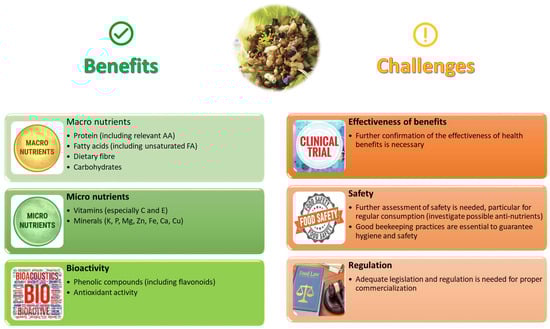 One advantage of honeybee larvae is the positive connotation to the honeybees, their familiarity with human, their capability of giving us honey, and their role as pollinators. All these positive perceptions are allies to the introduction of honeybee brood into human consumption in Western societies. Nevertheless, it is important to inform consumers that the consumption of drone brood does not imply consuming the bees themselves, which are highly important for the environment, biodiversity, and pollination []. The consumption of drone brood, however, has advantages for the hives and for the beekeepers, who usually discard this valuable resource []. The production of drone frames in the hive can have advantages for the welfare of the bees by helping control Varroa spp. mites, which are parasites that cause colony losses and diminish the productivity of the bees. The use of this technique constitutes a natural way of eliminating Varroa, avoiding the use of harmful chemical substances [].