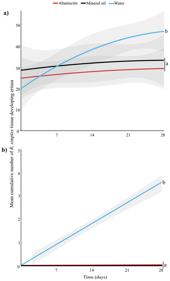 Mean cumulative number of Ruellia simplex tissue (stems, leaves, buds and flowers) developing erinea over time (days) after (a) curative application and (b) prophylactic treatment application. Statistically different treatments are separated with lowercase letters (N = 30 for each treatment, Kruskal–Wallis, p < 0.05). Gray shaded areas represent the predicted standard error, generated by R program.