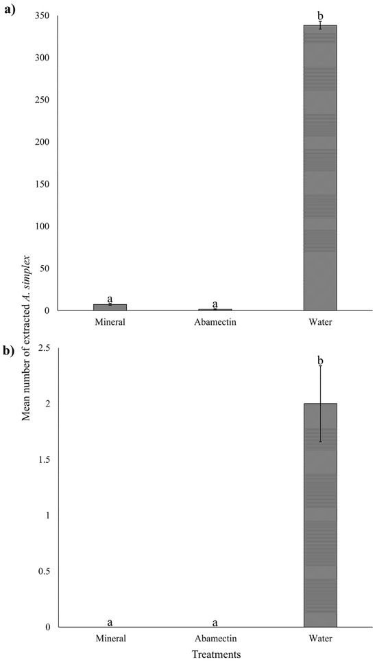 In curative application, the mean number of extracted A. simplex from plants treated with abamectin (1.56 ± 0.42) (mean ± SE) and mineral oil (7.33 ± 1.10) was significantly lower than plants treated with water (338.4 ± 4.65) (Kruskal–Wallis: χ2 = 59.35, df = 2, p < 0.001) (Figure 3a). In the prophylactic application, the number of extracted mites also varied with treatment (Kruskal–Wallis: χ2 = 22.15, df = 2, p < 0.001). No mites were extracted from the abamectin and mineral oil treatments, whereas a low number of mites was extracted from the water-treated plants (2 ± 0.34) (Figure 3b).