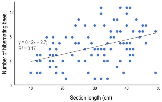 The average number of hibernating bees was 6.3 ± 3.1 (1–13), and although some variation among the bamboo species was observed—the number was statistically higher in B. multiplex 8.2 ± 3.5 (1–13), and lower in P. pubescens 4.9 ± 2.0 (2–8)—there was no clear difference among bamboo species (Table 5). In terms of the morphometrics of the bamboo sections, the section length (Figure 4) and the diameter (Figure 5) are presented as scatter plots. Section length was positively correlated with the number of hibernating bees, but diameter was not (p = 0.05, regression analysis). The positive correlations could be derived from the relatively large sample number (=99). The average sex ratio (% of females to total bees) was 62.7%, and the ratio varied from 50.0 to 83.3% among bamboo species, but significant variation was not detected among bamboo species (Table 5).