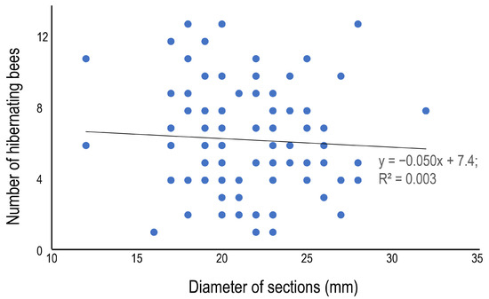 Relationship between the diameter and the number of hibernating bees in the internode section at site 1.