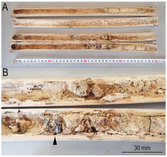 Internode filled by Dinoderus japonicus frass. (A) Transverse sections; (B) close-up of the internode section filled by the frass. A bee covered by the frass is indicated with an arrowhead.